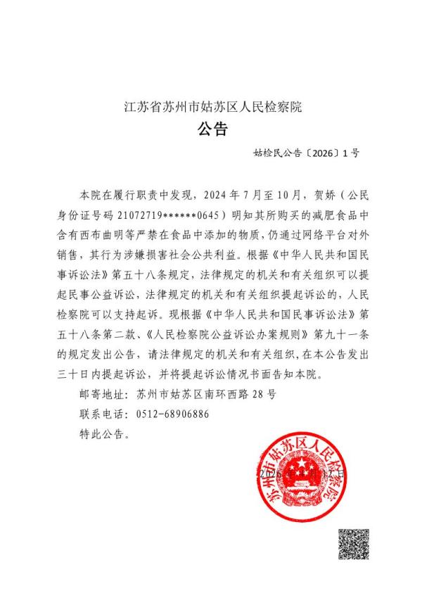 本院在履行职责中发现,2024年7月至10月,贺娇(公民身份证号码21072719******0645)明知其所购买的减肥食品中含有西布曲明等严禁在食品中添加的物质,仍通过网络平台对外销售,其行为涉嫌损害社会公共利益。根据《中华人民共和国民事诉讼法》第五十八条规定,法律规定的机关和有关组织可以提起民事公益诉讼,法律规定的机关和有关组织提起诉讼的,人民检察院可以支持起诉。现根据《中华人民共和国民事诉讼法》第五十八条第二款、《人民检察院公益诉讼办案规则》第九十一条的规定发出公告,请法律规定的机关和有关组织,在本公告发出三十日内提起诉讼,并将提起诉讼情况书面告知本院。